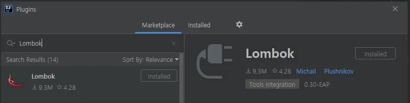 플러그인에서 Lombok 설치 이후 IDE 재시작