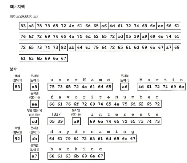 위 그림의 바이트열을 보면 첫 번째 파이트는 0x83인데 0x뒤의 8과 3은 각각 이어지는 애용이 세 개의 필드(하위 4비트=0x03)를 가진 객체(상위 4비트: 0x80)라는 뜻이다. 여기서 객체가 15개 넘는 필드를 가진다면 다른 타입 지시자를 얻어 필드 수를 2 또는 4바이트로 부호화한다.