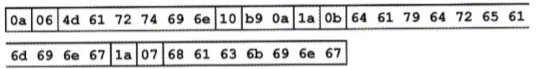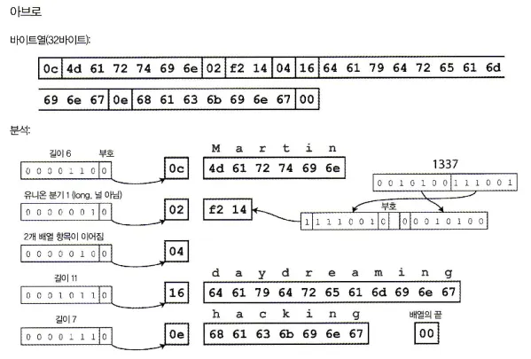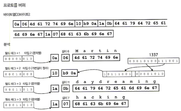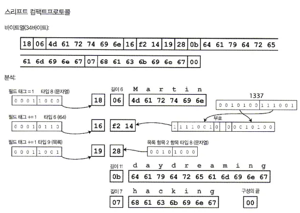 위 그림에서 바이트열과 분석을 살펴보면, 메시지팩과 유사하지만, 필드 이름(username, favoriteNumber, interests)이 없는 대신 부호화된 데이터는 숫자(1, 2, 3)같은 필드 태그(field tag)를 포함한다. 필드 태그는 필드의 별칭같이 상요되며 철자 없이도 어떤 필드를 다루는지 알려주는 쉬운 방법이다.