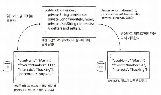 즉, 애플리케이션의 새로운 버전이 즉시 반영이 안된다는 점인데, 이 경우 새 버전과 구 버전이 동시에 공존하는 상황이 생길 수 있고, 이 때 하위 호환성(신 버전의 코드가 구 버전의 데이터를 읽을 수 있어야 한다.)과 상위 호환성(구 버전의 코드가 신 버전의 새로운 데이터를 읽을 수 있어야 한다.)