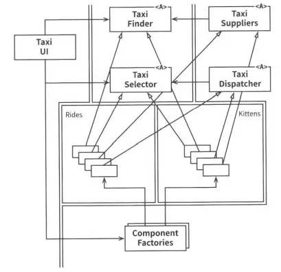 원래 서비스의 로직 중 대다수가 이 객체 모델의 기반 클래스들 내부로 녹아들었다. 하지만 배차에 특화된 로직 부분은 Rides 컴포넌트로 추출되고, 야옹이에 대한 신규 기능은 Kittens 컴포넌트에 들어갔다. 이 두 컴포넌트는 기존 컴포넌트들에 있는 추상 기반 클래스를 템플릿 메서드(Template Method)나 전략(Strategy) 패턴등을 이용해 오버라이드한다. 두 개의 신규 컴포넌트인 Rides와 Kittens가 의존성 규칙을 준수한다는 점에 주목하자. 그리고 이 기능들을 구현하는 클래스들은 UI의 제어하에 팩토리(Factories)가 생성한다는 점도 주목하자.