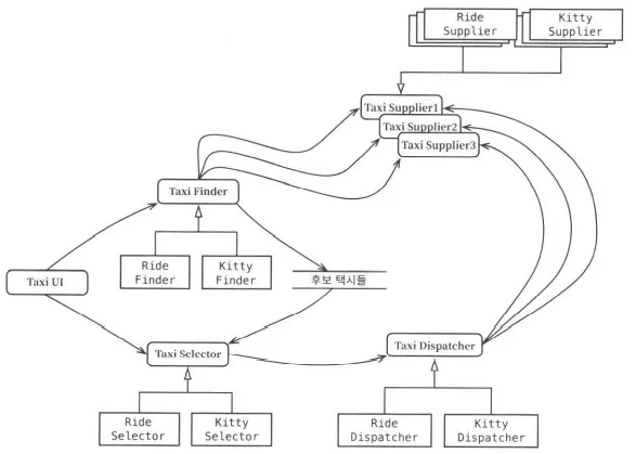 이 시스템은 해당 도시에서 운영되는 많은 택시 업체를 알고, 고객은 승차 요청을 할 수 있다.