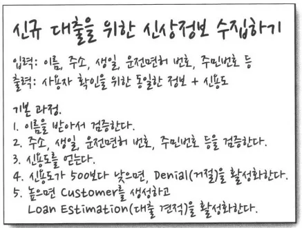은행에서 대출 담당자가 신청자의 신상정보를 수집하여 검증한 후, 신청자의 신용도가 500보다 낮다면 대출 견적을 제공하지 않기로 결정했다고 해 보자. 따라서 시스템에서 신상정보 화면을 모두 채우고 검증한 후, 신용도가 하한선보다 높은지가 확인된 이후에 대출 견적 화면으로 진행되어야 한다는 식으로 은행에서 업무 요건을 기술했다고 해보자.