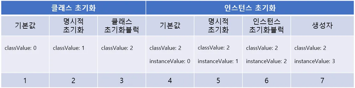 : 변수 선언과 동시에 초기화 하는 것을 명시적 초기화라 하는데, 위에서 소개한 변수의 초기화와 동일하며, 클래스 및 지역변수 어디서든 사용가능하며 여러 초기화 방법중 최우선적으로 고려한다.