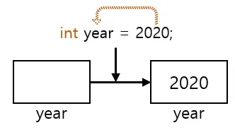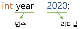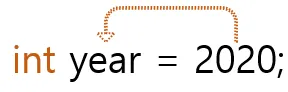 변수에 값을 저장할 때는 대입 연산자 =을 사용한다. 그림 3을 보면 year라는 int 변수타입과 year라는 변수 이름을 가진 변수에게 2020이라는 값을 대입합니다.