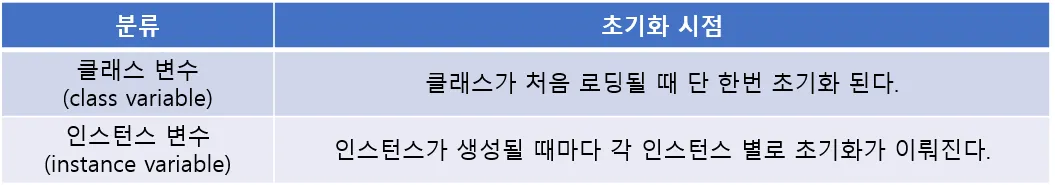 :클래스 영역에 선언되며, 클래스의 인스턴스를 생성할 때 만들어진다. 그렇기에 인스턴스 변수 값을 읽어오거나 저장하기 위해서는 먼저 인스턴스를 생성해야 한다.