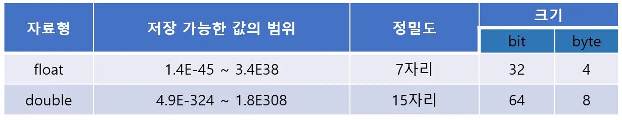 위 표를 보면 float의 정밀도는 7자리로 10진수로 7자리의 수를 오차없이 저장할 수 있다는 의미다.