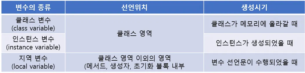 클래스 내부에 선언되는 변수를 멤버변수라 한다. 여기서 static키워드가 붙은 변수를 클래스 변수, static 키워드가 없는 변수를 인스턴스 변수라 한다. 그리고 메서드 내부에 있는 localValue는 지역변수이다. 이 셋 모두의 범위와 생성시기는 다르다.