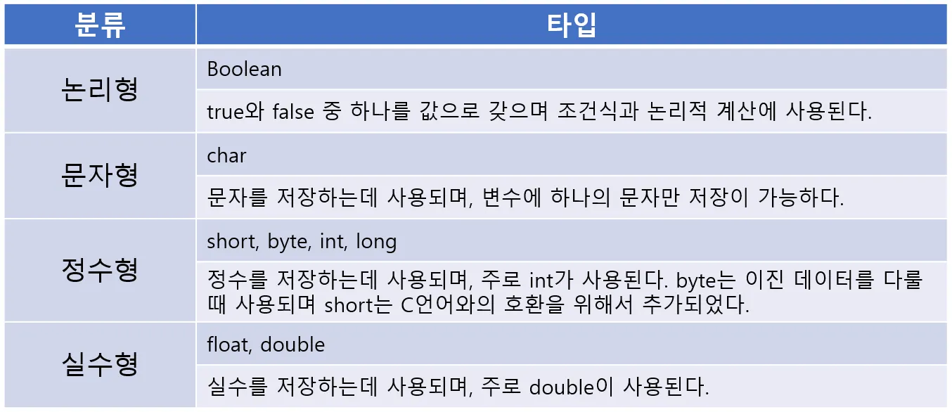 : 논리형(boolean), 문자형(char), 정수형(byte, short, int, long), 실수형(float, double) 계산을 위한 실제 값을 저장한다.