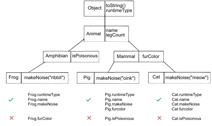 하지만, 부모가 아닌 형제 클래스(ex: Frog 클래스의 부모클래스(Amphibian)의 형제인 Mammal 클래스)의 프로퍼티나 메소드는 접근할 수 없다.