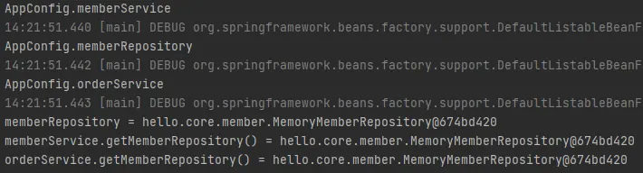 실행결과를 보면 세가지 빈의 memberRepository의 참조값이 모두 같은걸 알 수 있다.