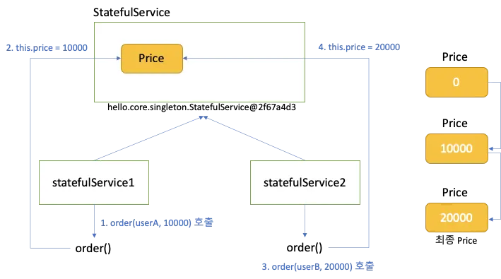 이는 두 개의 객체 인스턴스인 statefulService1과 statefulService2가 같은 객체 인스턴스 StatefulService 객체를 바라보기 때문인데, statefulService1에서 userA가 10000원을 주문하면서 price에 10000원이 대입되었지만, 그 뒤 statefulService2에서 userB가 20000원을 주문했다. 그래서 price에는 20000원이 대입되는데 여기서 price 필드는 싱글톤으로 하나의 객체 인스턴스를 통해 공유되기 때문에 userA는 자신이 주문한 뒤 주문한 userB의 금액이 입력되는 것이다.