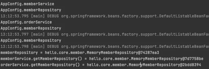 그런데, 여기서 memberRepository내부 코드는 MemoryMemberRepository 인스턴스를 생성해 반환하는 것이다. 그럼 memberService, orderService, memberRepository에서 총 세 번 내부 코드가 실행되는데, 싱글톤이 어떻게 유지되는지 의아할 것이다. 우리의 생각대로라면 해당 구성정보의 빈들이 등록되면 memberService와 orderService, memberRepository에서 꺼낸 각각의 memberRepository의 객체 참조주소가 달라야 한다. 이를 코드를 통해 바로 확인해보자.