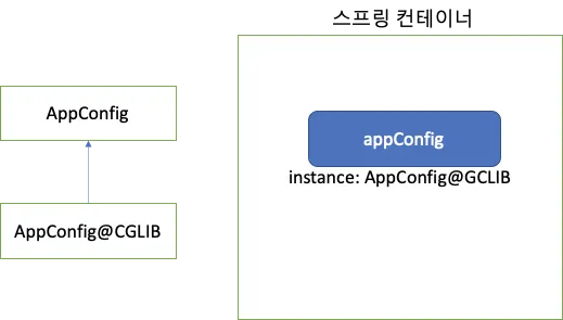 이렇게 바이트코드 조작을 통해 만들어진 AppConfig@CGLIB에서 싱글톤이 보장되도록 해준다. 그러면서도 해당 객체는 AppConfig의 자식 타입으로 만들어져 AppConfig타입으로 조회가 가능하다.