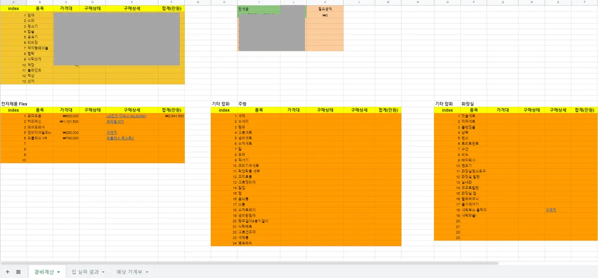 입주에 필요한 전세금, 필요한 가구, 전자제품, 기타 잡화, 욕실용품 등 모든 필요 물품들을 정리 및 적절한 제품을 찾으면 그에대한 구매사이트와 가격도 정리했다.