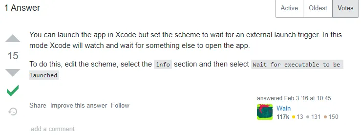 답변을 보고 나는 edit the scheme에 들어가서 Wait for executable to be launched을 선택해서 프로젝트를 시작하니 성공적으로 not running 상태를 디버깅 할 수 있게 되었다.