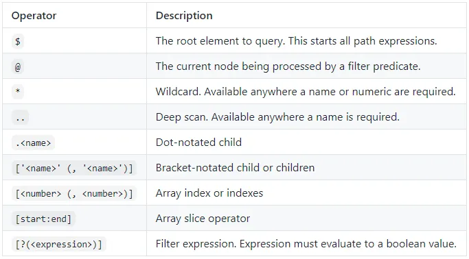 JSONpath에서는 아래와같은 문법을 이용해 요소를 탐색할 수 있다.