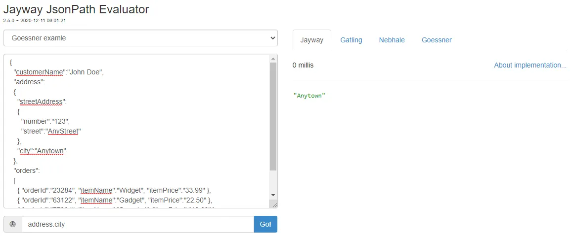 예를들어, 아래와같은 JSON 데이터에서 city라는 key의 value를 얻어오고자 한다면 위의 나와있는 문법을 참고하면 $.address.city가 된다 한번 테스트 사이트에가서 테스트를 해보자.