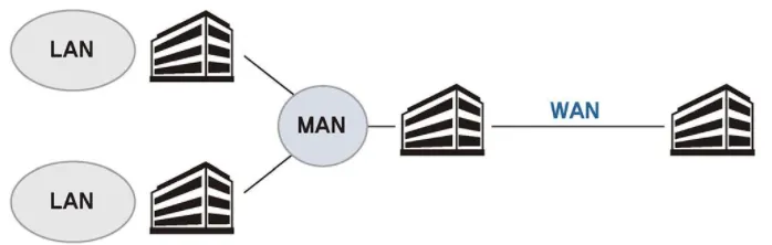 한 도시의 범위(수십 km)를 연결하는 개념으로 보통 도시 단위 네트워크를 구성할 때 통신사가 이미 가지고 있는 인프라를 기반으로 구축하는 경우 WAN, 자체 인프라로 구축하면 MAN으로 구분하기도 한다.