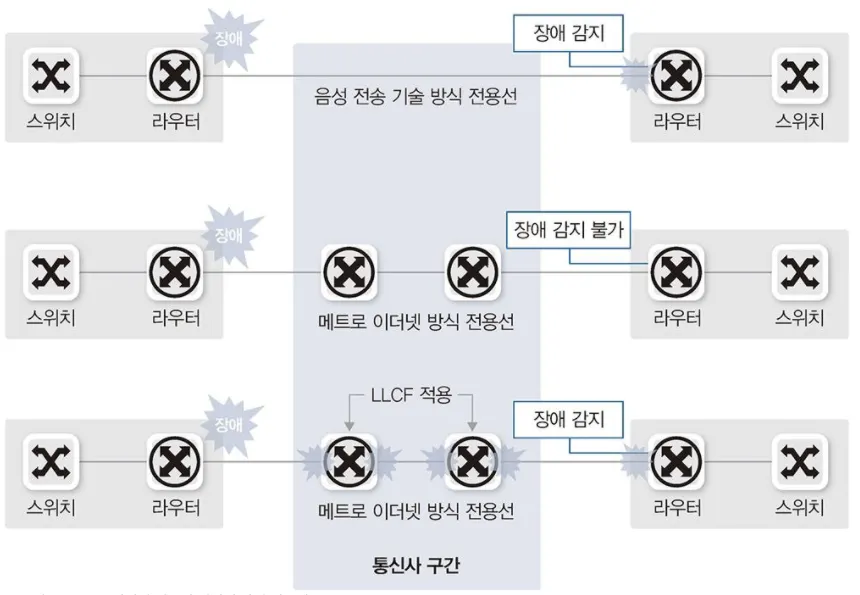 전용 회선을 이더넷으로 구성할 때 LLCF를 설정하지 않으면 한 사이트에서 다운되더라도 반대쪽 사이트에서는 회선이 그대로 살아있는것처럼 보이기에 회선 개통후 회선사에서 LLCF 설정 확인을 해야 한다.