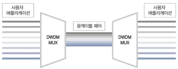 WDM과 DWDM기술은 하나의 광 케이블에 다른 파장의 빛을 통해 여러 채널을 만드는 동시에 많은 데이터를 전송할 수 있다.