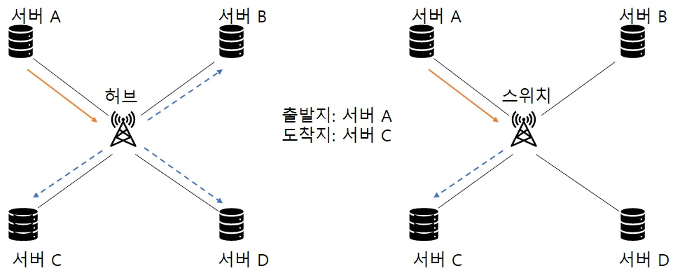 모든 포트로 전기신호를 보내는 허브(좌측)과 목적지를 인지해서 목적지로만 전기 신호를 보내는 스위치(우측)