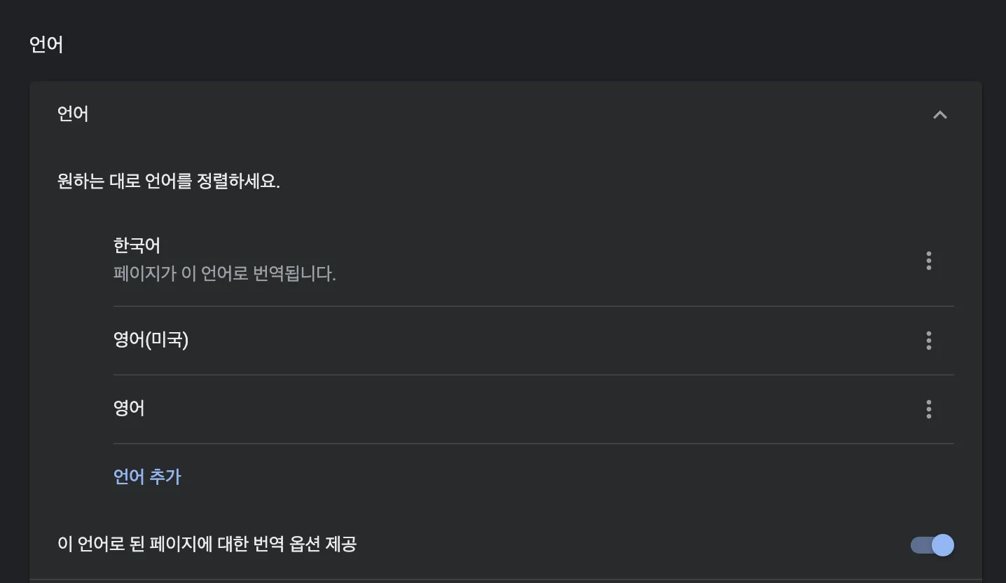 크롬 - 설정 - 고급 - 언어에가면 언어를 정렬할 수 있다.