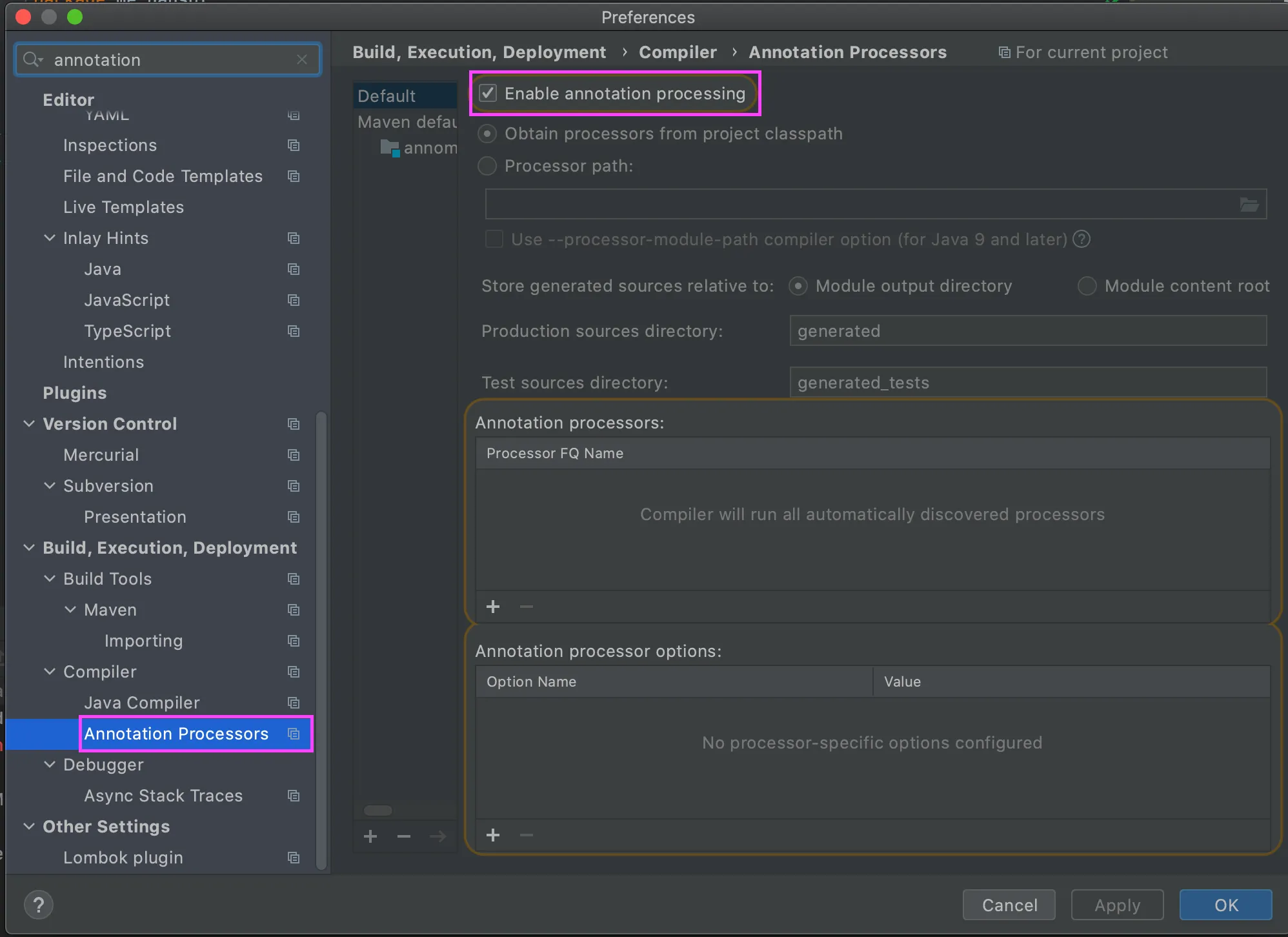 설정에서 enable annotation processor 체크 확인