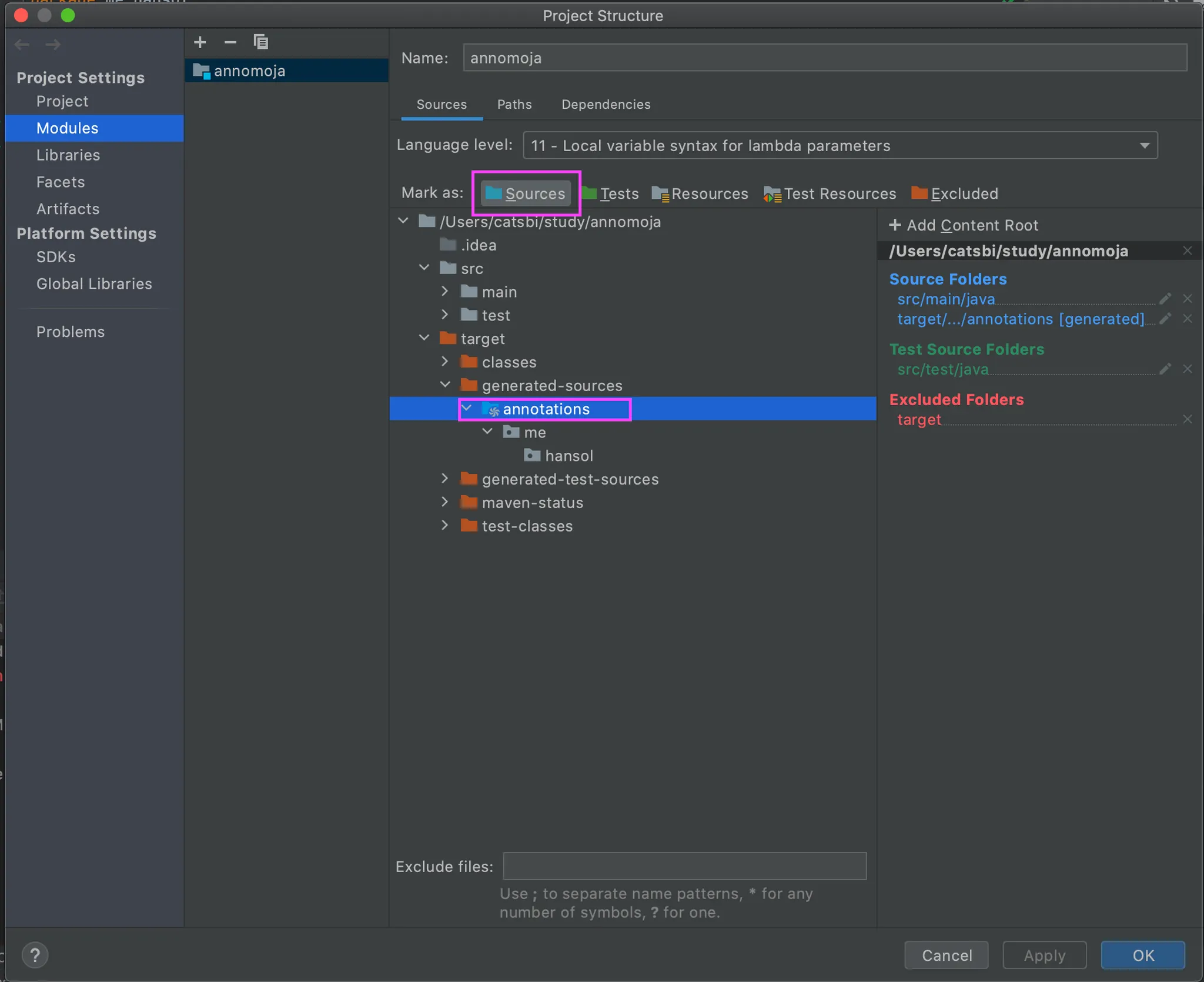 기존에는 예외처리되있어서 소스에서 사용을 할 수 없기에 애노테이션 프로세서를 통해 생성된 클래스가 위치한 generated-sources / annotations 를 Sources 로 선택해 마크해줍니다.