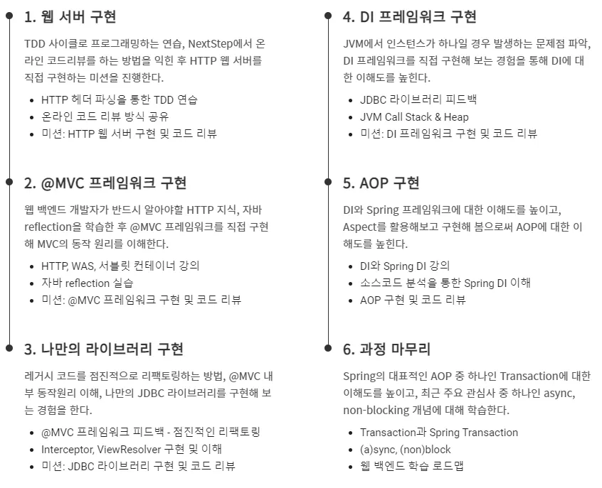 3년차 백엔드 개발자가 되면서, 나름 충실하게 공부를 해왔고 스프링의 대략적인 라이프사이클이나 구조들에 대해서도 학습을 했지만, 조금 더 해보고싶은 마음과 4~6번 미션이 특히 관심이 가서 수강을 하게 되었다.
