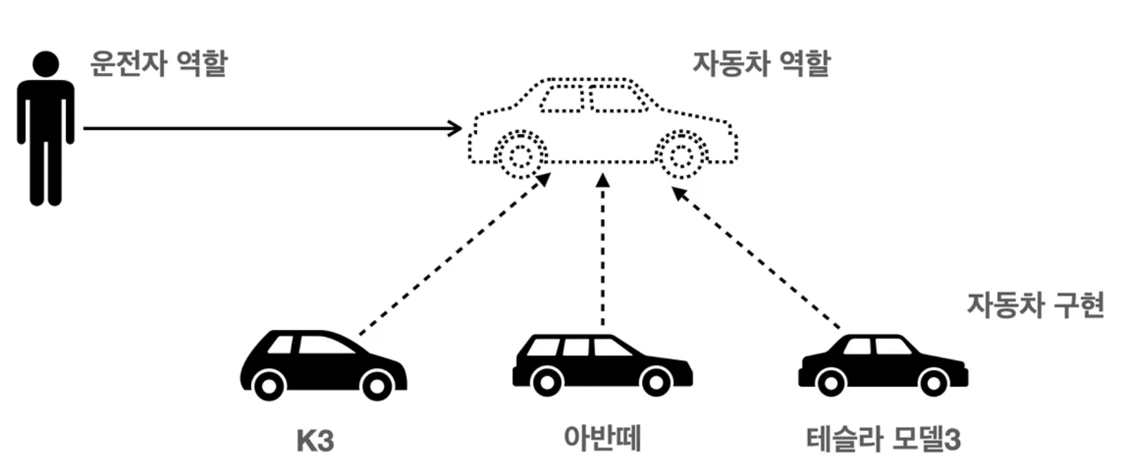 이 말은 자동차 역할이 제공해야할 기능들만 구현한다면 얼마든지 새로운 자동차를 만들수 있다는 확장성을 제공한다. 이는 책임주도설계(RDD)와도 연관되는 키워드이다. 결국 해당 객체는 해당 객체의 책임만 성실히 이행한다면 내부가 어떤가는 중요하지 않다.