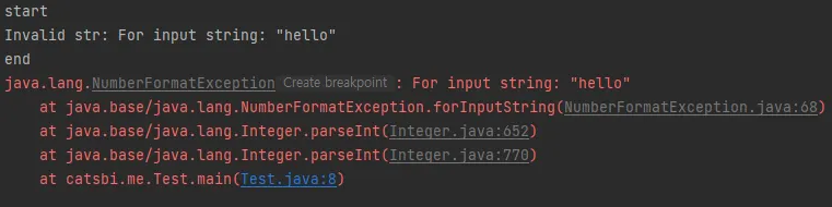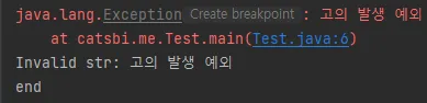 코드를 실행하면 처음 strings[0] 출력은 정상적으로 되 hello가 출력된다. 그리고 그 다음 strings[4]를 출력하려고하니 존재하지 않는 범위의 값이 아니기 때문에 ArrayIndexOutOfBoundsException 예외가 발생해 catch 블럭 내의 코드가 수행된다. 그 다음 다시 try구문으로 돌아가 코드를 수행하는게 아닌 try-catch 구문을 벗어나 다음 문장이 수행되기에 end가 출력되고 종료된다.