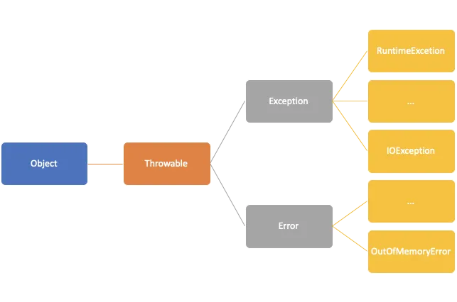 자바 최상위 객체인 Object를 필두로 에러객체와 예외 객체가 있다. 그리고 에러 최상위 객체인 Throwble을 상속받는 Error와 Exception이 있다.