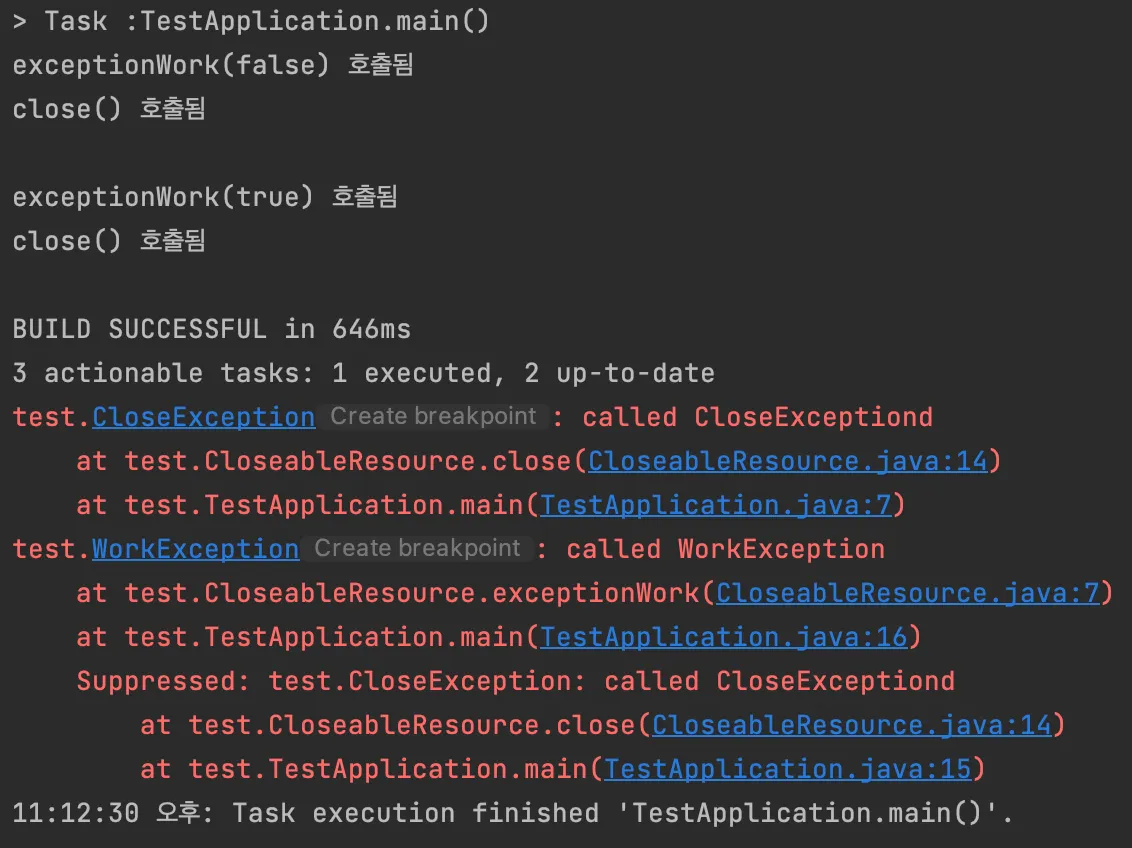 그렇기에 실제로 발생하는 (try 블럭 내부 로직 예외)예외는 정상적으로 출력되고 close()에서 발생하는 예외는 억제된(suppressed) 예외로 실제 발생하는 예외 내부에 포함되어 노출된다.