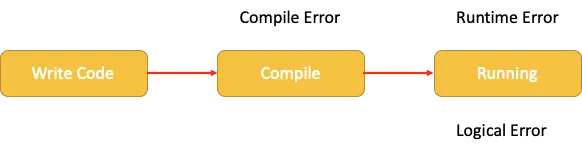 Compile Error: 컴파일 시점에서 발생하는 에러로 소스코드를 컴파일러가 컴파일하는 시점에서 소스의 오타나 잘못된 구문, 자료형 체크등 검사를 수행하는데 여기서 발생하는 에러를 컴파일 에러라 하며 이 시점에서 발생하는 문제들을 수정 후 컴파일을 성공적으로 마칠경우 클래스 파일(*.class) 파일이 생성된다.