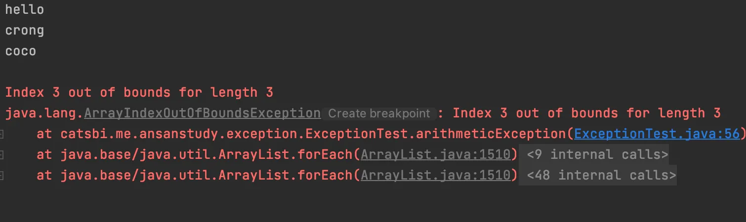 이 에러가 발생하는 이유역시 결과창에 다 나오고 있는데, 길이가 3인 배열의 index 3을 찾으려 하기에 에러가 발생했다는데, 예외 클래스명과 연관지어서 생각하면, 배열의 길이를 벗어난 인덱스의 값을 가져오려 했기에 생긴 문제라는 것이다.