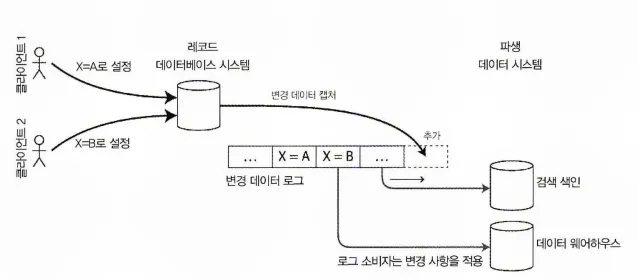 변경 데이터 캡처에서 애플리케이션은 DB를 변경 가능한 방식으로 사용해 레코드를 자유롭게 갱신하고 삭제한다. 변경 로그는 DB에서 저수준으로 추출한다(Ex: 복제 로그 파싱). 변경 로그는 DB에서 추출한 쓰기 순서가 실제로 데이터를 기록한 순서와 일치하고 경쟁 조건이 나타나지 않게 보장한다. DB에 기록하는 애플리케이션은 CDC가 실행 중인지 알 필요가 없다.