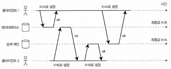 이벤트 소싱과 변경 데이터 캡처의 가장 큰 단점은 이벤트 로그의 소비가 대개 비동기로 이뤄진다는 점이다. 그래서 사용자가 로그에 이벤트를 기록하고 이어서 로그에서 파생된 뷰를 읽어도 기록한 이벤트가 아직 읽기 뷰에 반영되지 않았을 가능성이 있다.