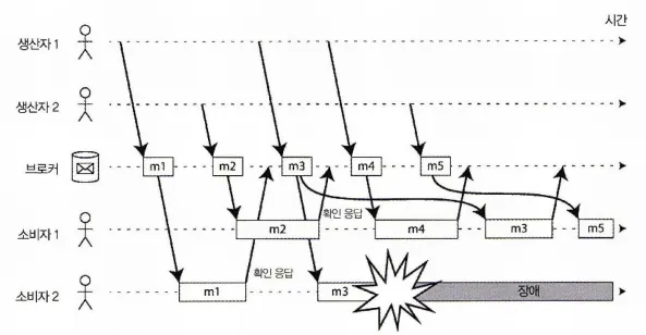 위 그림을 보면 소비자1이 메시지m4를 처리하고 있을 떄 소비자2가 메시지 m3를 처리하가에러발 생한하다. m3는 확인 응답을 받지 못해 소비자 1로 재전송된다.