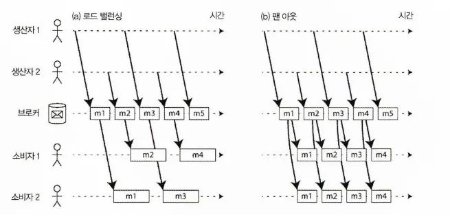 (b) 팬 아웃: 각 메시지를 복수 개의 소비자로 전달