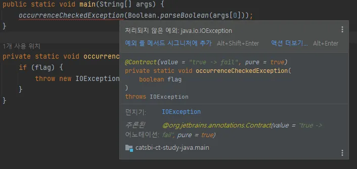 이를 해결하기 위해서는 try-catch 혹은 throw로 상위 호출자로 던져야 한다.