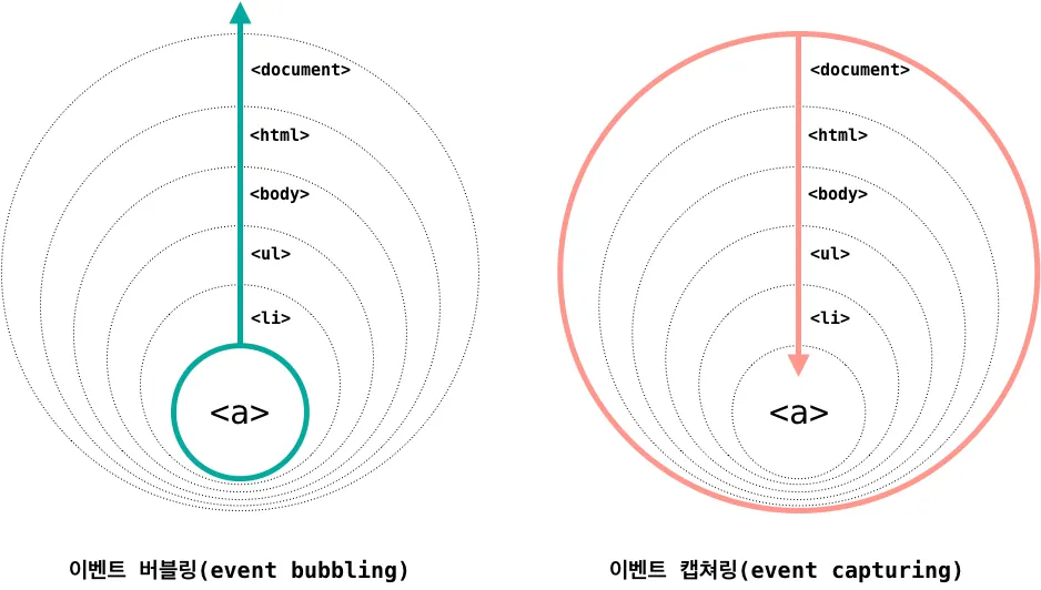 이벤트 캡쳐링: 이벤트가 가장 바깥쪽의 노드로부터 시작해서 안쪽으로 전파되어 들어오는 방식
