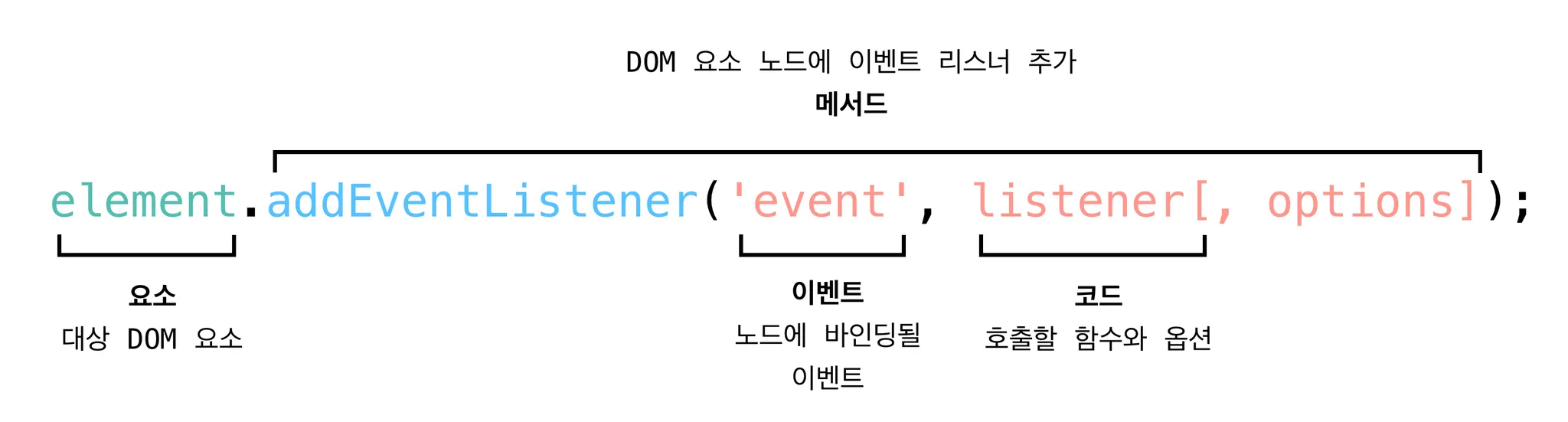 eventHandler: 이벤트가 발생했을 때 실행될 코드. 예제에서는 eventHandler()함수를 호출합니다. 여기서 메서드 호출인데 괄호(()) 가 생략된 이유는 괄호를 포함시킬 경우 즉시실행 함수가되어 이벤트가 바인딩 되는 시점에서 함수가 호출되기 때문에 의도와 다르게 동작을 합니다.