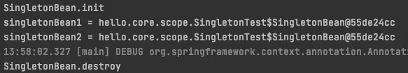 싱글톤 스코프의 스프링 빈은 여러번 호출해도 모두 같은 인스턴스 참조 주소값을 가진다.
