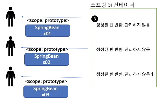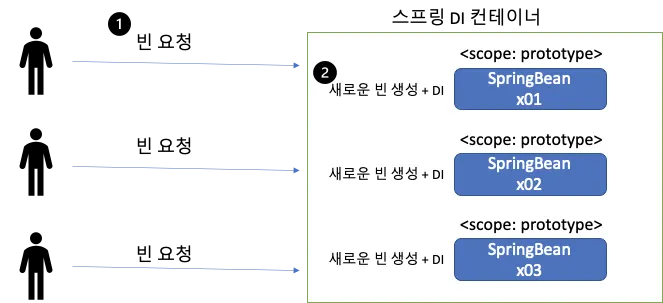 여기서 프로토타입은 싱글톤 타입의 스피링 빈과는 다르게 빈 생성, 의존관계 주입, 초기화까지만 진행한다. 그렇기에 그 이후 스프링 빈을 클라이언트에 반환한 이후로는 관리하지 않기에 소멸 메서드같은것은 모두 클라이언트에서 자체적으로 관리해야 한다.
