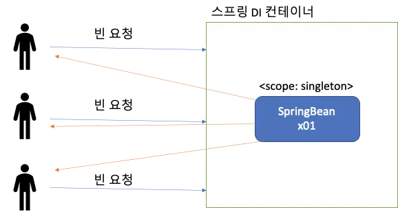 기존의 스프링 컨테이너에 등록된 스프링 빈은 싱글톤 스코프라고 말을 하였으며, 그렇기에 스프링 컨테이너는 항상 같은 인스턴스의 스프링 빈을 반환한다.