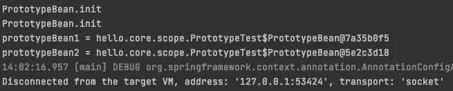 의도한대로 매번 새로운 프로토타입 빈이 생성되는 것을 확인할 수 있다.