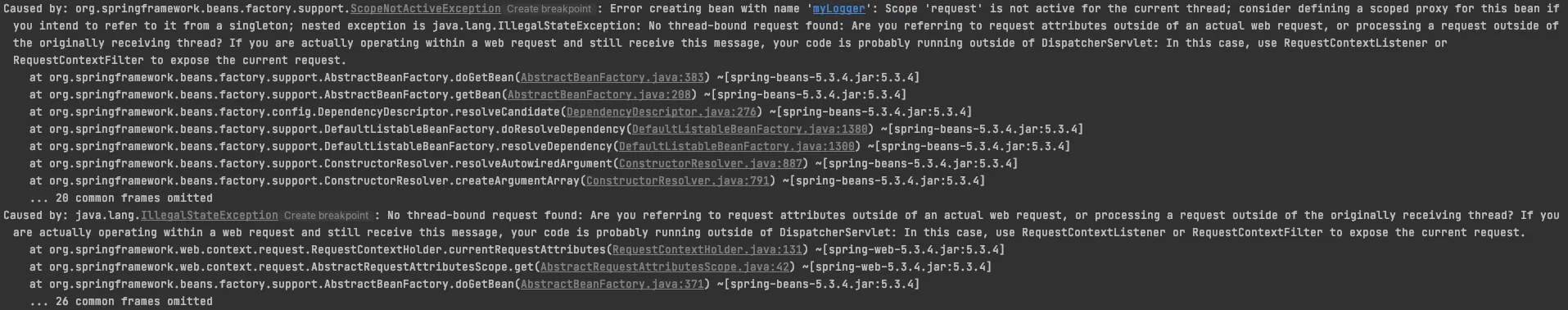 마지막으로 정리하면, 스프링 구동시 MyLogger 스프링 빈을 등록을 요구하는데 해당 빈은 자신이 생성되야 할 스코프 범위에 해당되지 않았기 때문에 에러가 발생한다.