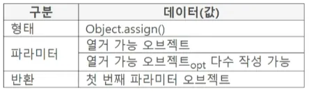 두 번째 파라미터의 오브젝트 프로퍼티를 첫 번째 파라미터의 오브젝트에 복사 후 첫 번째를 반환합니다.