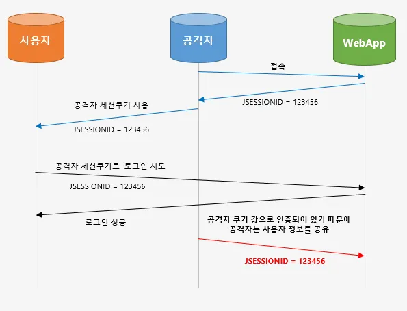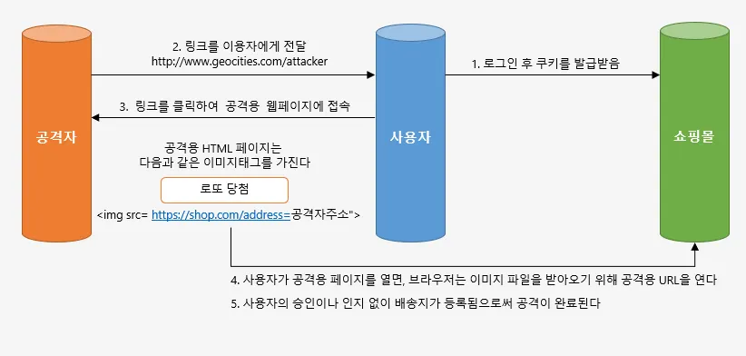 : 사용자가 쇼핑몰에 접속하여 로그인 후 쿠키를 발급받은 뒤 공격자가 사용자의 이메일로 특정 링크를 전달하고 사용자가 해당 링크를 클릭하게 되면, 공격용 웹페이지에 접속하게 되고, 해당페이지에 '로또당첨'이라는 이미지가 노출된다. 그리고 유저가 로또당첨 이미지를 클릭하면 쇼핑몰에 특정 URL로 요청을 하게되는데 해당 쿠키정보를 가지고 있기 때문에 해당 요청에 대해서 정상적으로 동작을 하게 된다.